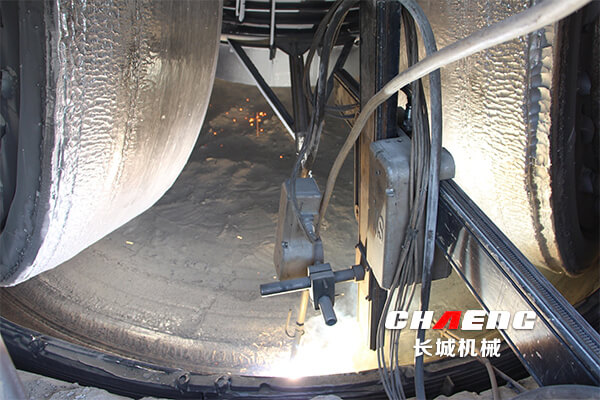 4、使用特種耐磨焊絲進(jìn)行明弧自動(dòng)焊,堆焊緩沖層和耐磨層,厚度12mm,表面花紋為一字紋或者菱形加點(diǎn)紋(客戶選擇)。保證外圓直徑達(dá)到圖紙要求。